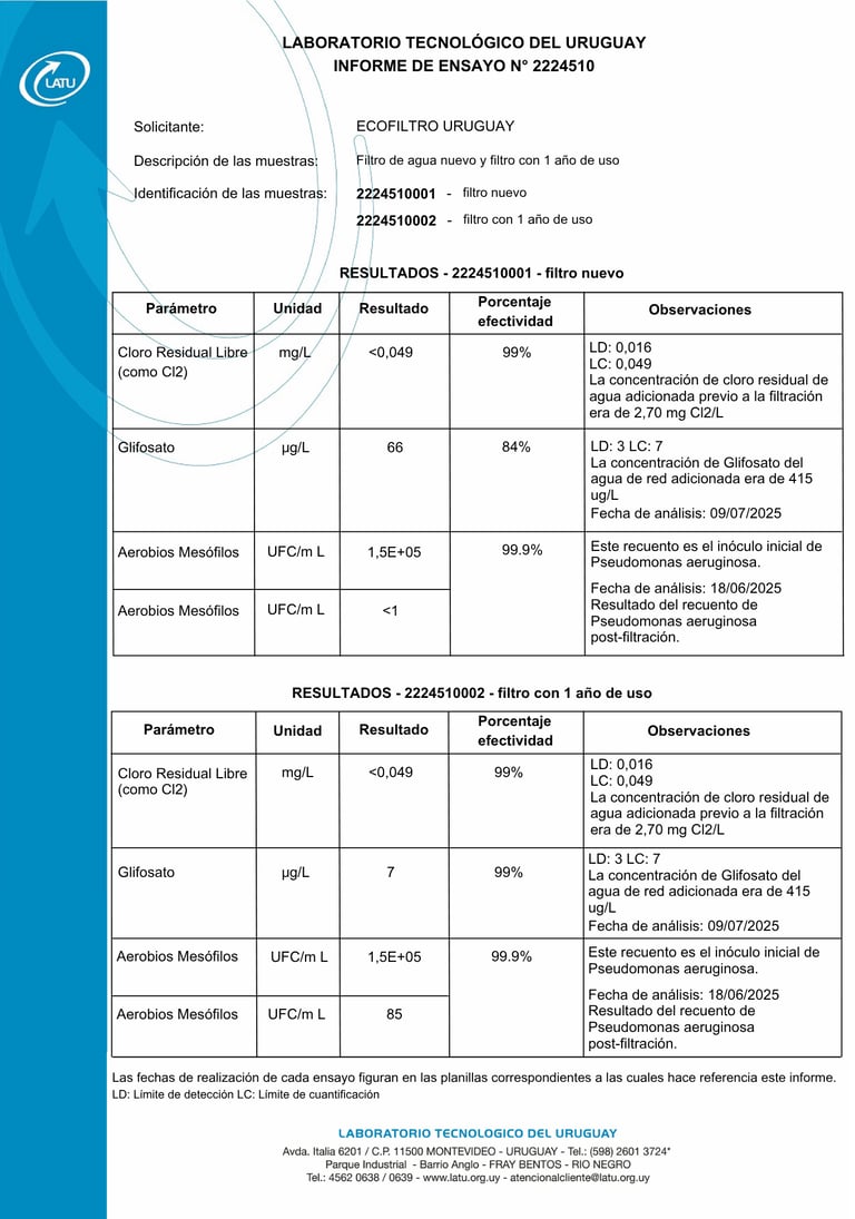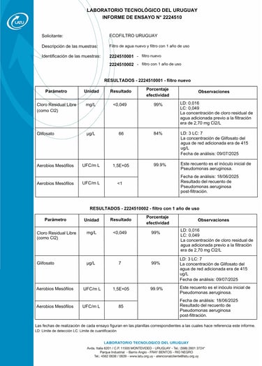 Resultados de laboratorios con certificaciones internacionales sobre la efectividad de Ecofiltro para purificar agua.